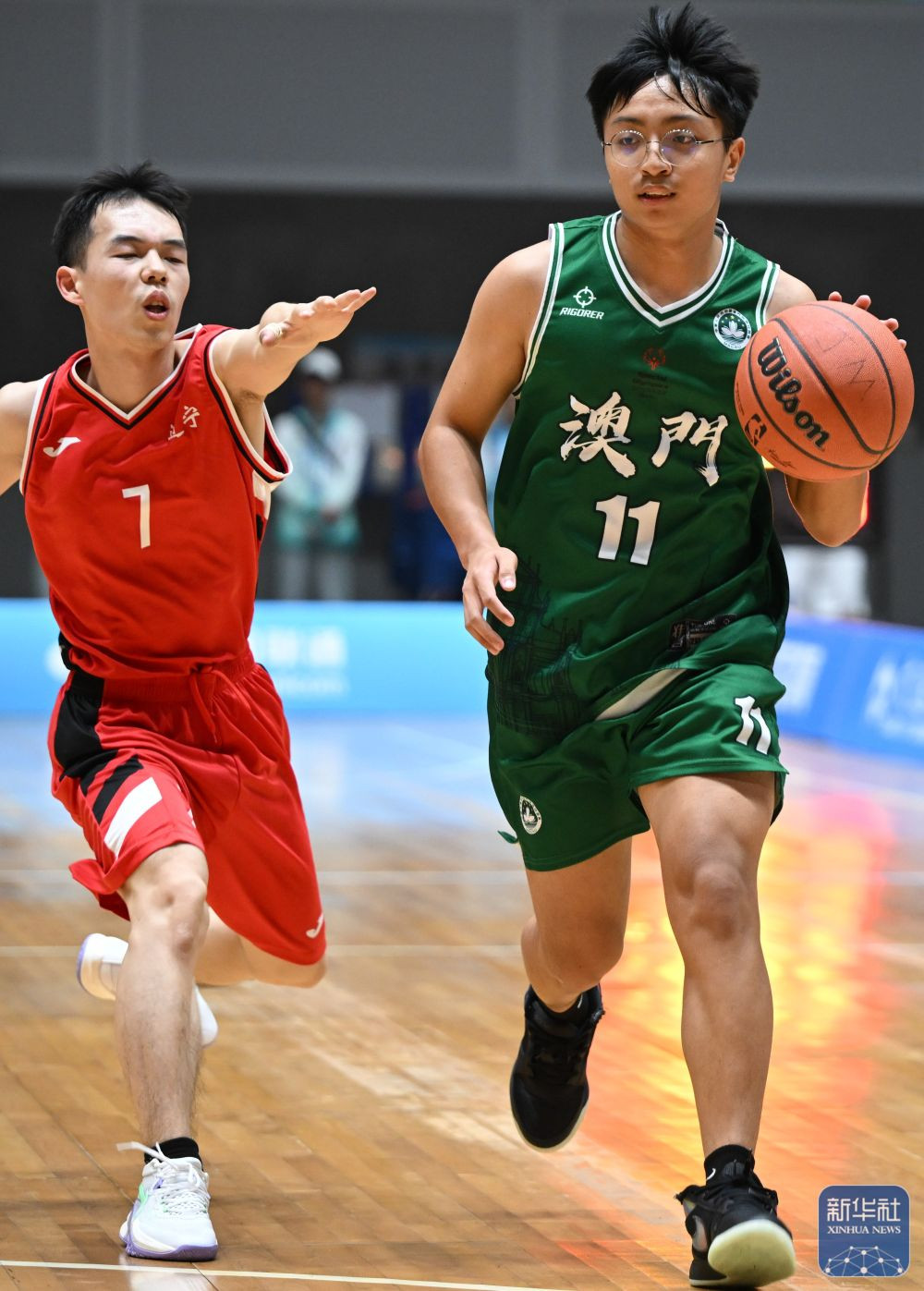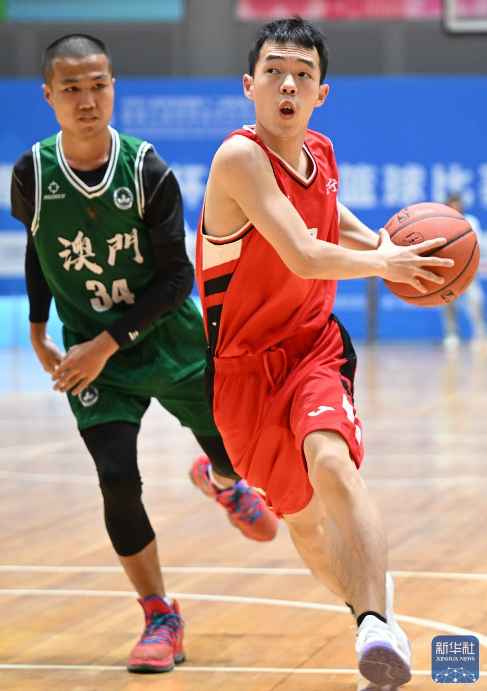 ↑澳门一团球员黄津伟(右)在比赛中带球突破。