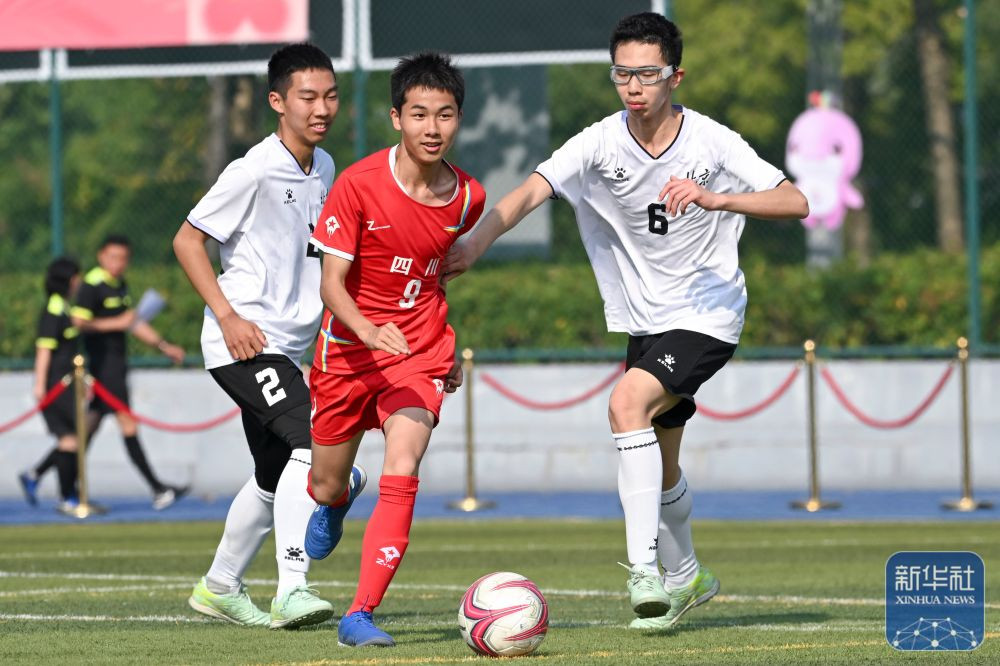 ↑四川队球员刘伟铭(中)与北京队球员陈嘉霖(右)在比赛中拼抢。