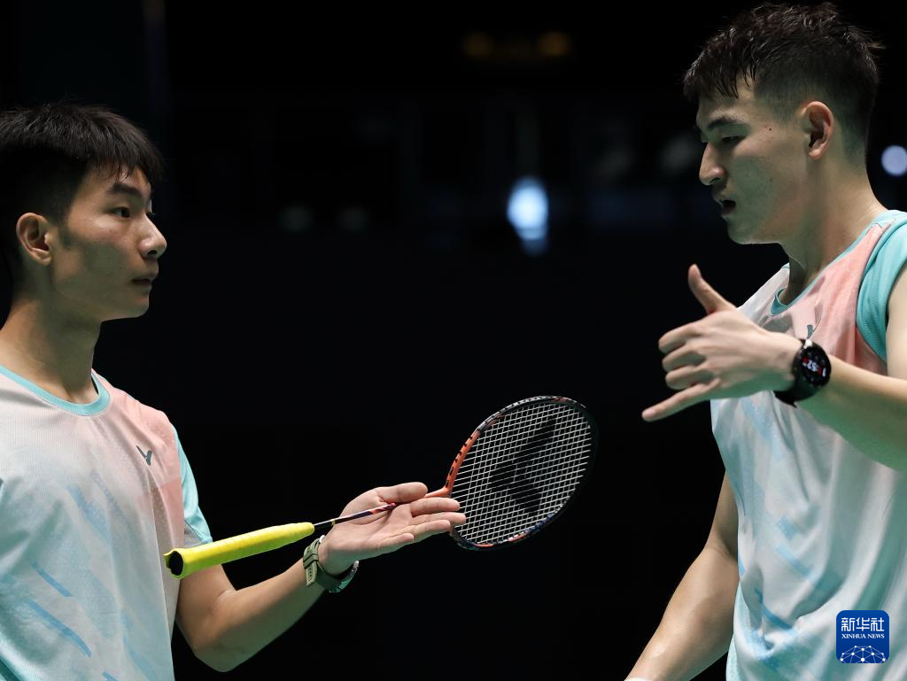 12月11日,湖北队组合丁奕博/宋绍阳(左)在比赛中用手语交流。湖北队选手组合丁奕博/宋绍阳在男子双打比赛中2比1战胜贵州队组合龙福伦/文耀东。