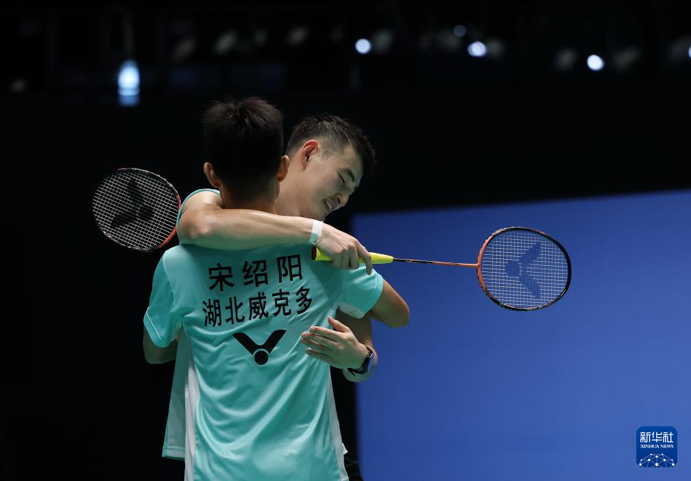 12月11日,湖北队组合丁奕博/宋绍阳(前)在比赛后庆祝胜利。湖北队选手组合丁奕博/宋绍阳在男子双打比赛中2比1战胜贵州队组合龙福伦/文耀东。
