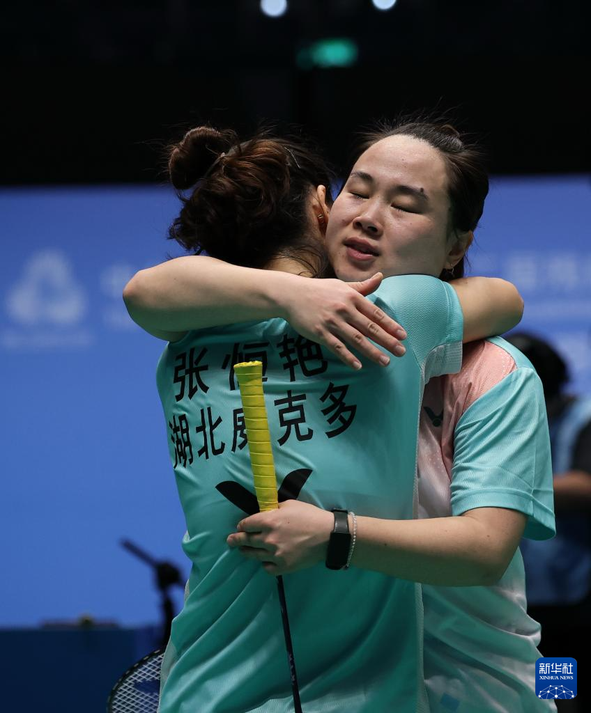 12月11日,湖北队组合江佳蕾/张恒艳(前)在比赛后庆祝胜利。湖北队选手组合江佳蕾/张恒艳在女子双打比赛中2比0战胜贵州队组合王孟兴/王欣。