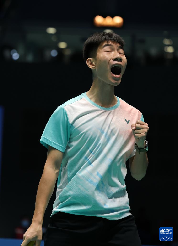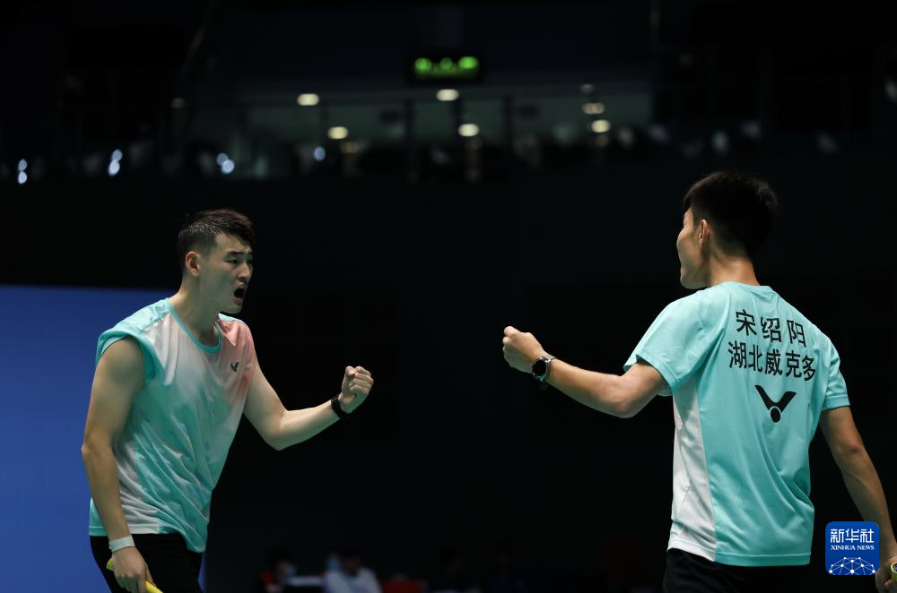 12月11日,湖北队组合丁奕博/宋绍阳(右)在比赛中庆祝得分。湖北队选手组合丁奕博/宋绍阳在男子双打比赛中2比1战胜贵州队组合龙福伦/文耀东。