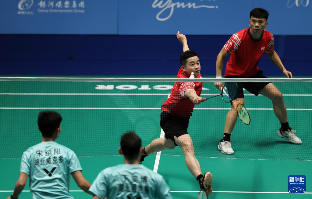 12月11日,贵州队组合龙福伦/文耀东(上左)在比赛中。湖北队选手组合丁奕博/宋绍阳在男子双打比赛中2比1战胜贵州队组合龙福伦/文耀东。