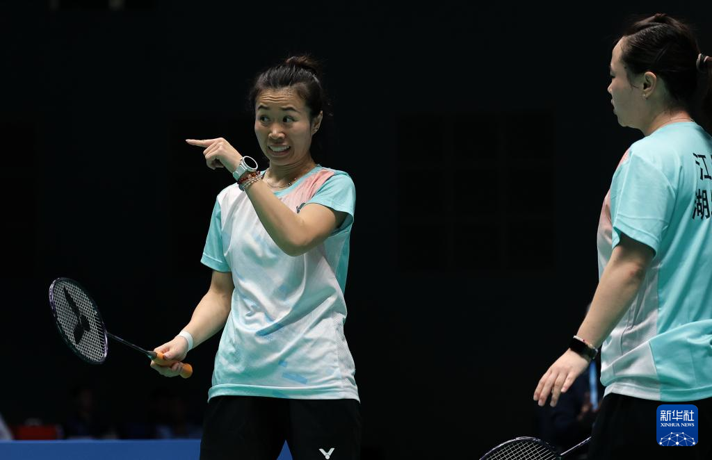12月11日,湖北队组合江佳蕾/张恒艳(左)在比赛中。湖北队选手组合江佳蕾/张恒艳在女子双打比赛中2比0战胜贵州队组合王孟兴/王欣。