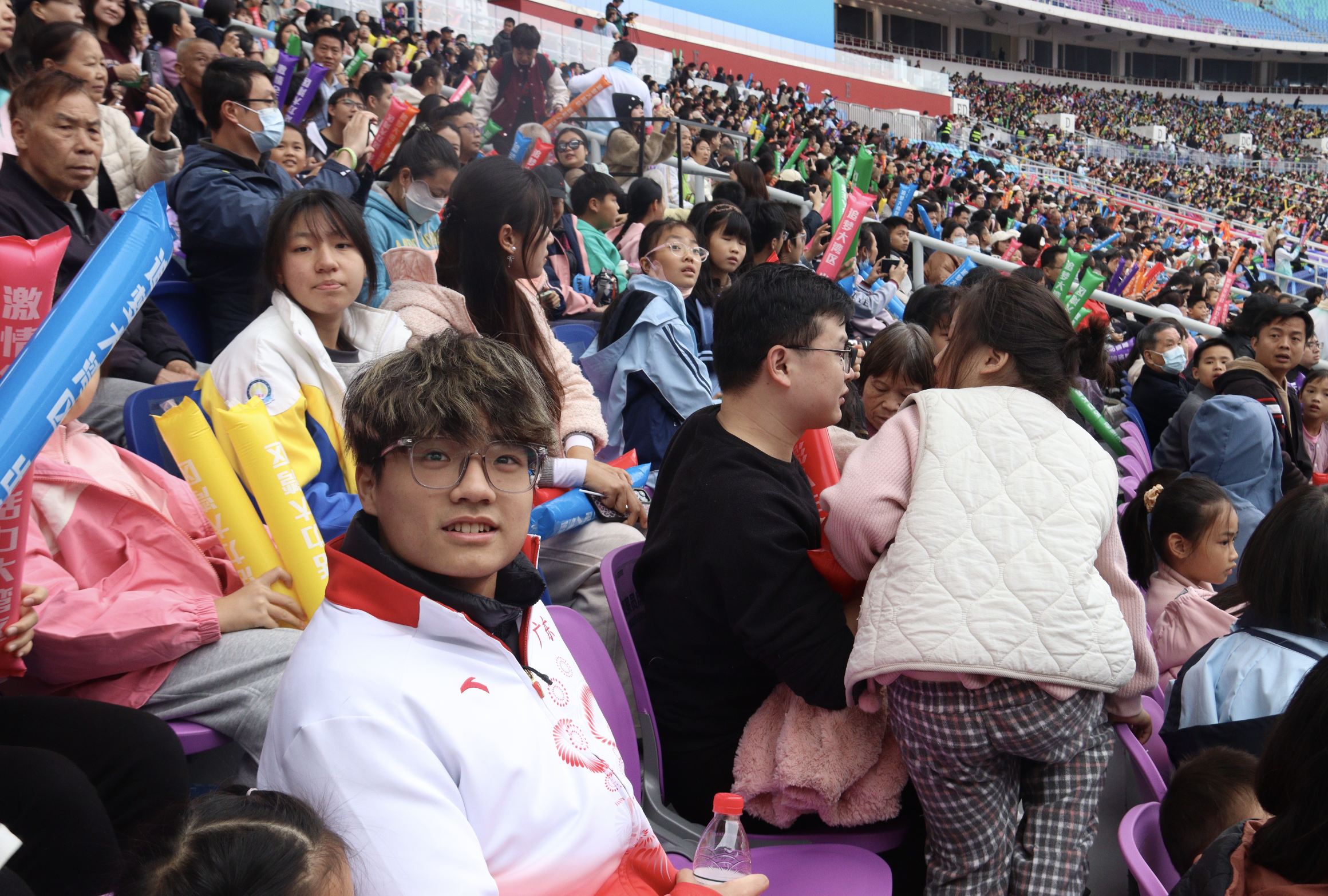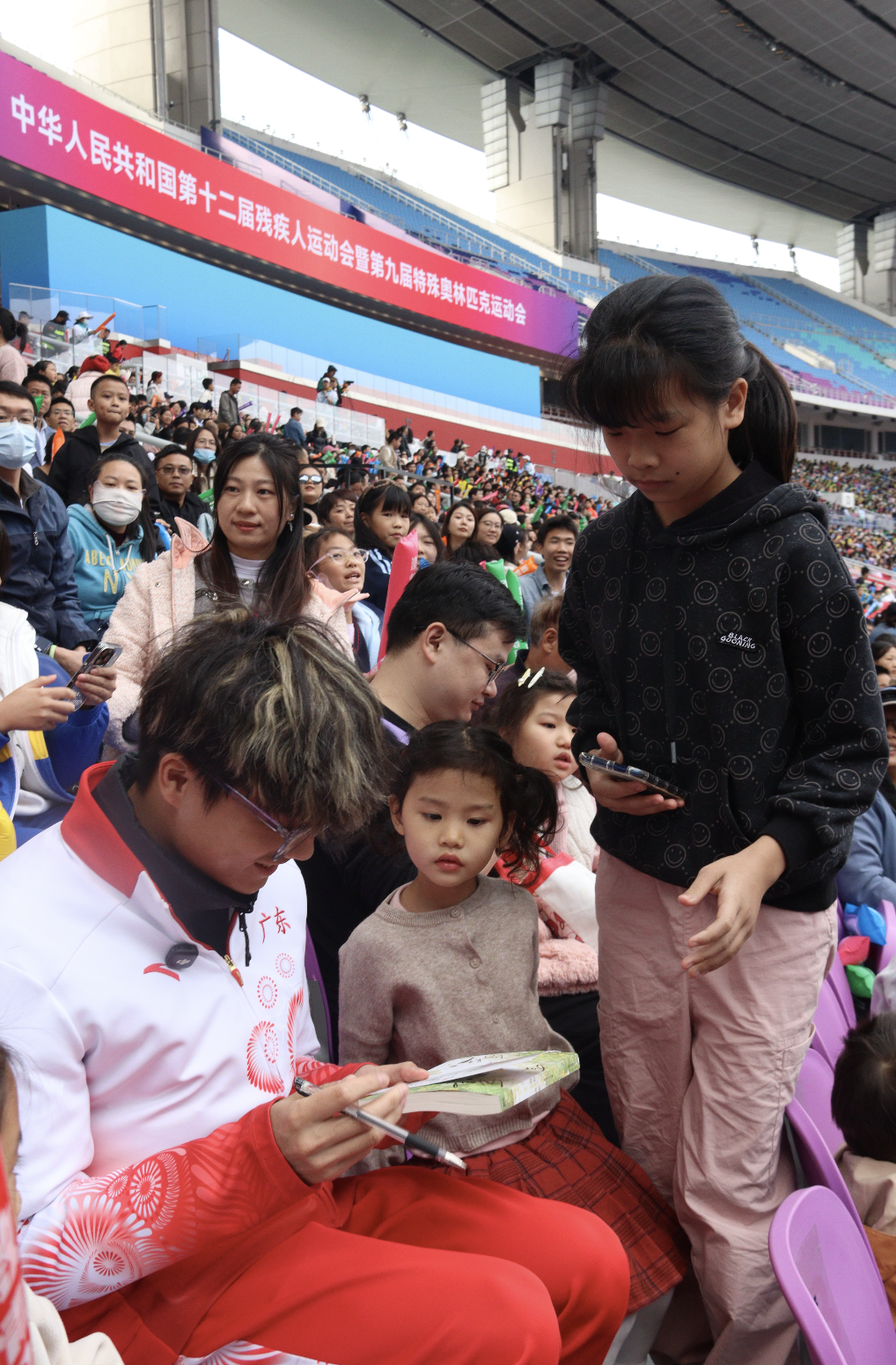 运动员梁宝棠走进观众席,与现场观众尤其是中小学生亲切互动,面对签名、合影的诉求来者不拒,温和的笑容与耐心的态度,让体育正能量直达人心。女子10000米听障决赛和男子10000米听障决赛,赢得22000多名现场观众阵阵欢呼,气氛燃爆全场。