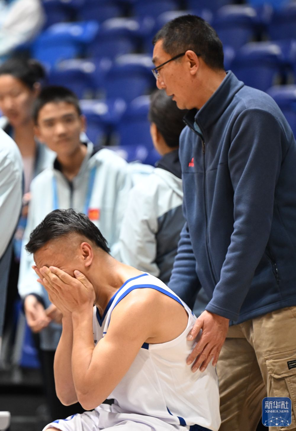 ↑ 山东队教练员在男子组决赛E组比赛后安慰球员王理想(左)。最终,山东队9比14不敌北京队。