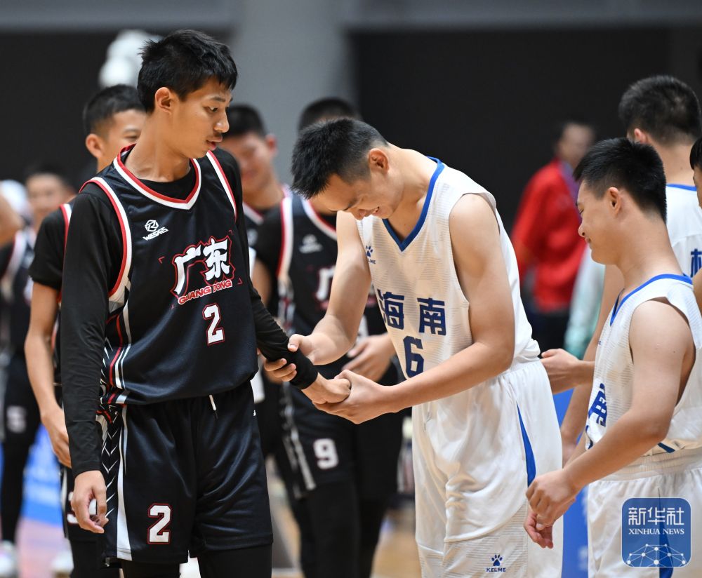↑ 广东一团队球员陈昊瑜(前左)在男子组决赛F组比赛后与海南队球员王崇岂(前中)握手致意。最终,广东一团队28比10战胜海南队。