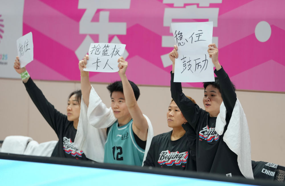 12月15日,北京队球员在场边举起提示场上队友的手写纸卡。新华社记者 肖恩楠 摄