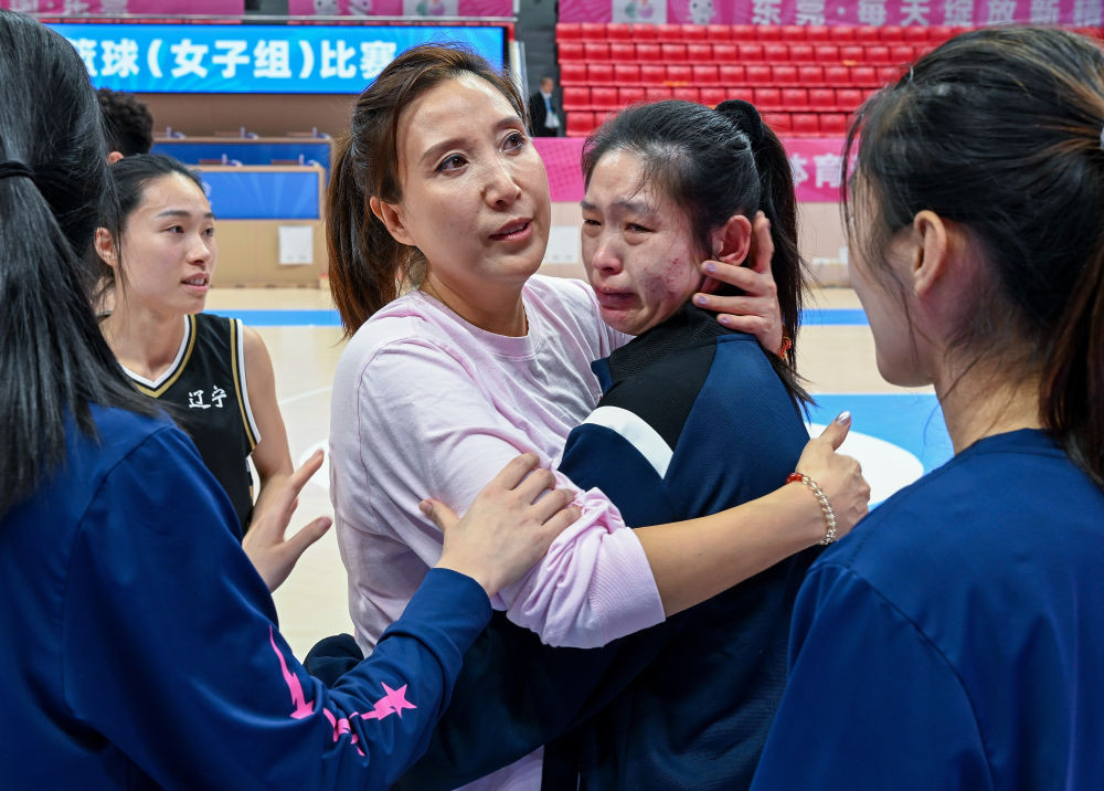 12月14日,在广东东莞举行的全国第十二届残疾人运动会暨第九届特殊奥林匹克运动会聋人篮球比赛女子组半决赛中,辽宁队88:65战胜广东一团队。辽宁队教练员夏丹(中)在比赛结束后拥抱落泪的队员陈铎。新华社记者 肖恩楠 摄