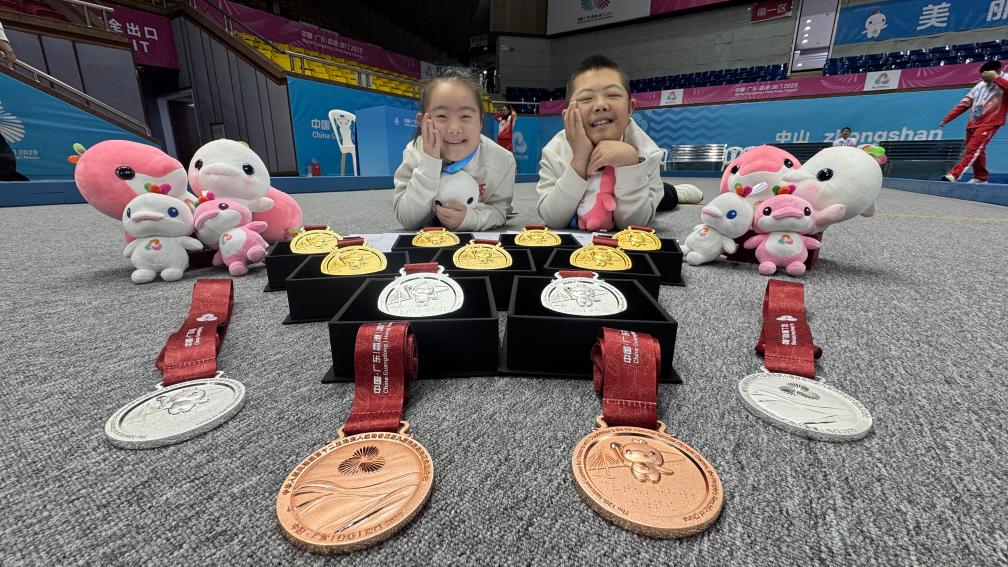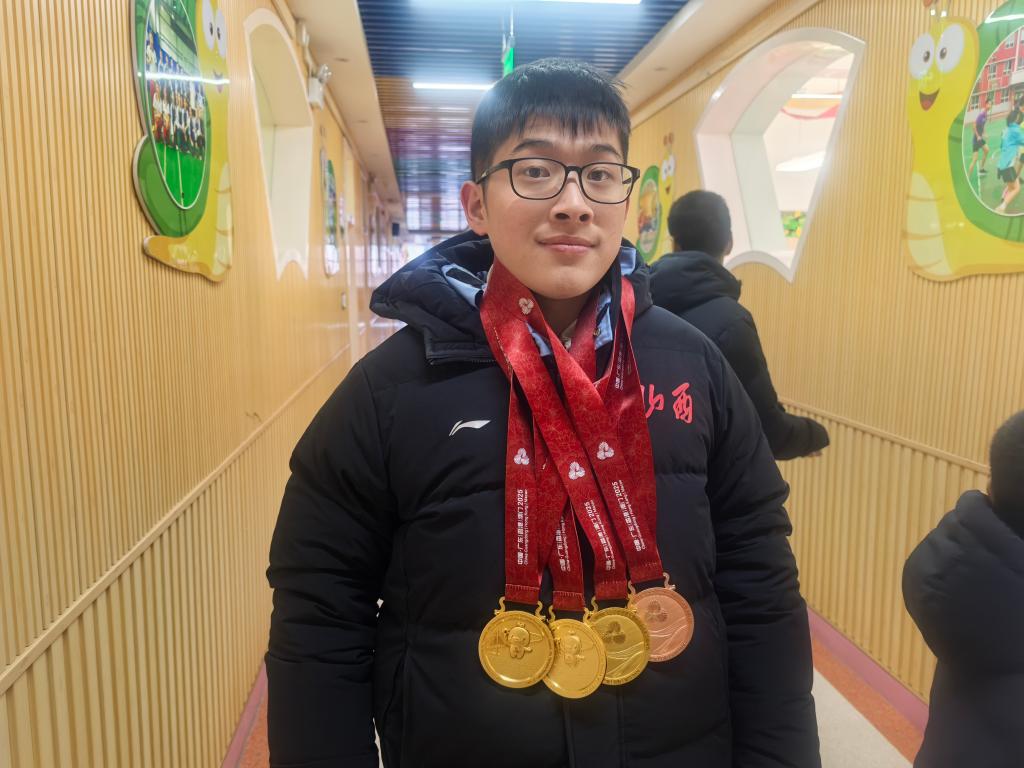 图为学生展示获得的奖牌