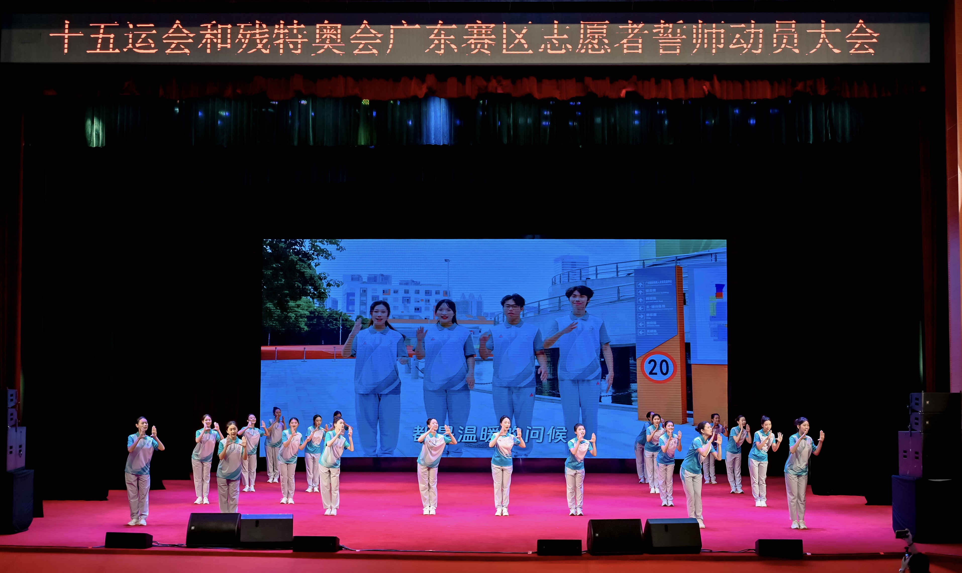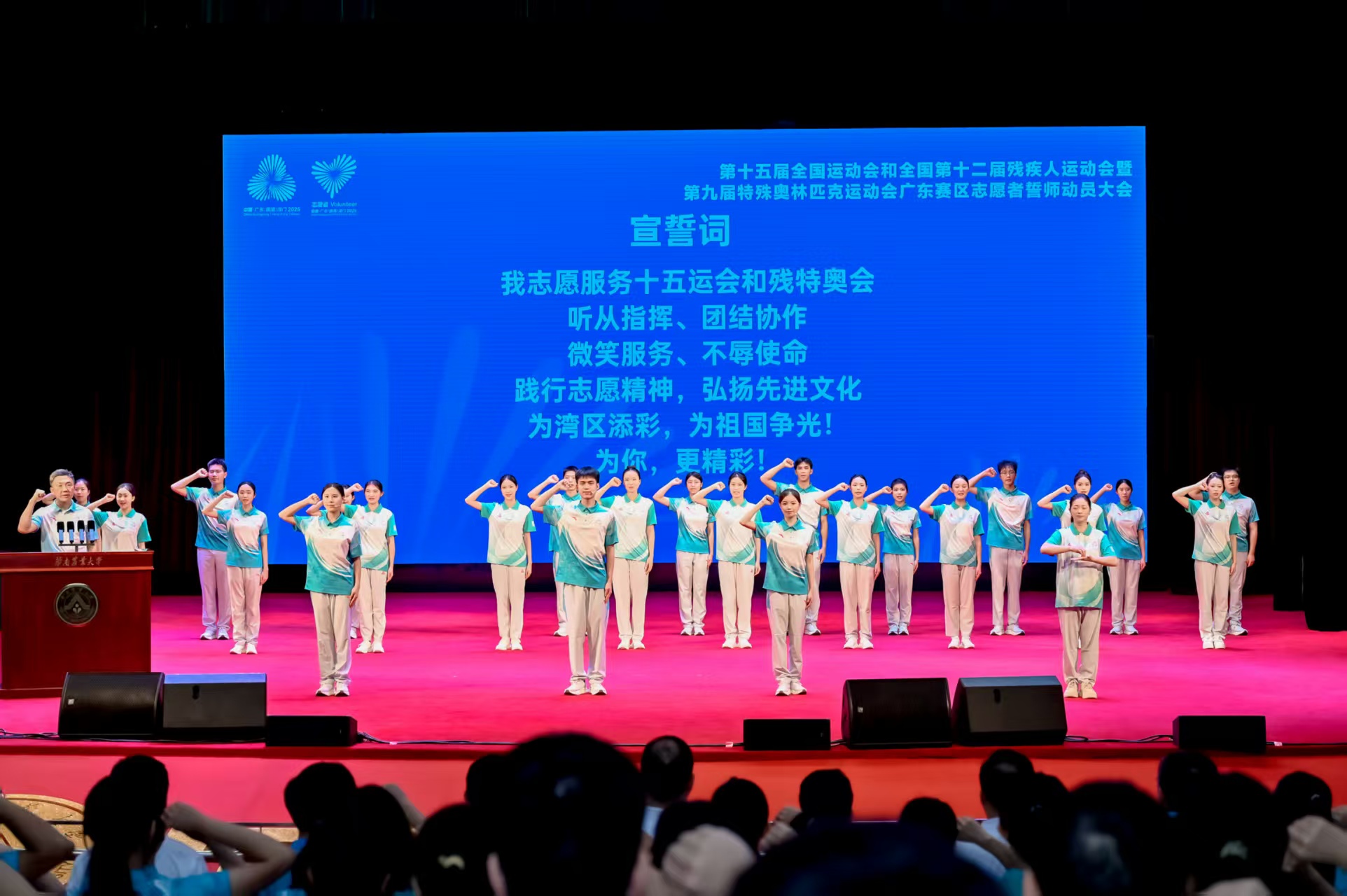 10月18日,十五运会和残特奥会广东赛区志愿者誓师动员大会在华南农业大学举行。香港赛区和澳门赛区志愿者代表、广东省有关单位领导、广东省执委会有关部室负责人、17个承办地市执委会赛会志愿服务工作负责人、99所任务高校分管领导和赛会志愿服务工作负责人、广东赛区志愿者代表等600人参加活动。