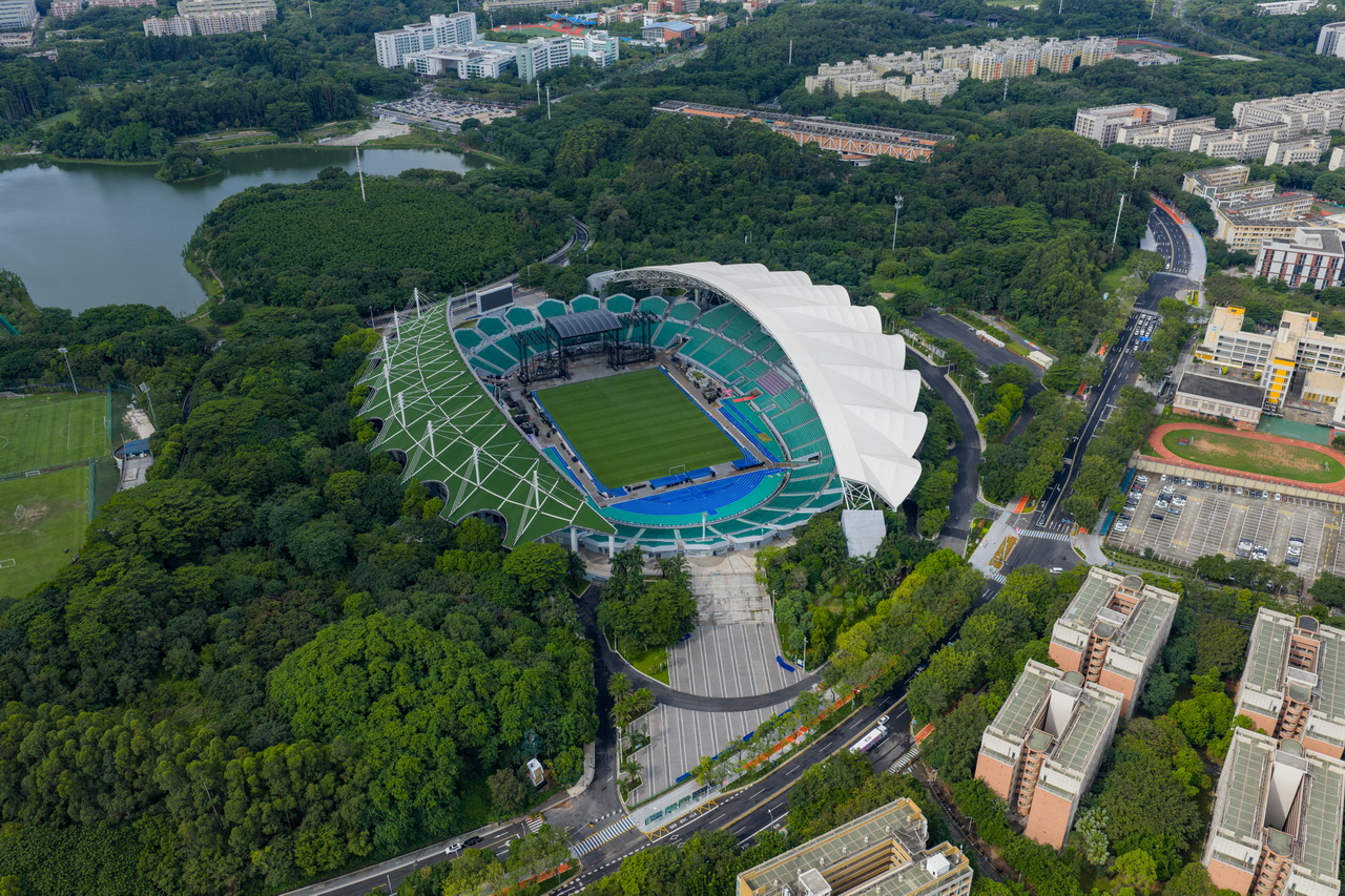 广州大学城体育中心体育场和环场路位于广州市番禺区小谷围街道大学城内环东路218号,整体工程的北、东、南三边被大学城内环东路环绕,西边为中心湖公园,工程用地范围内有大学城体育场、1、2#副场以及自行车馆、攀岩场等比赛场馆。工程改造总用地约88000平方米,建筑面积177平方米。改造后总坐席数约410席。本次改造分为滑轮赛道、周边环境提升、临建集装箱3部分的维修改造。本场馆为残特奥会专用场馆,承办残特奥会越野滑轮(大众)比赛。