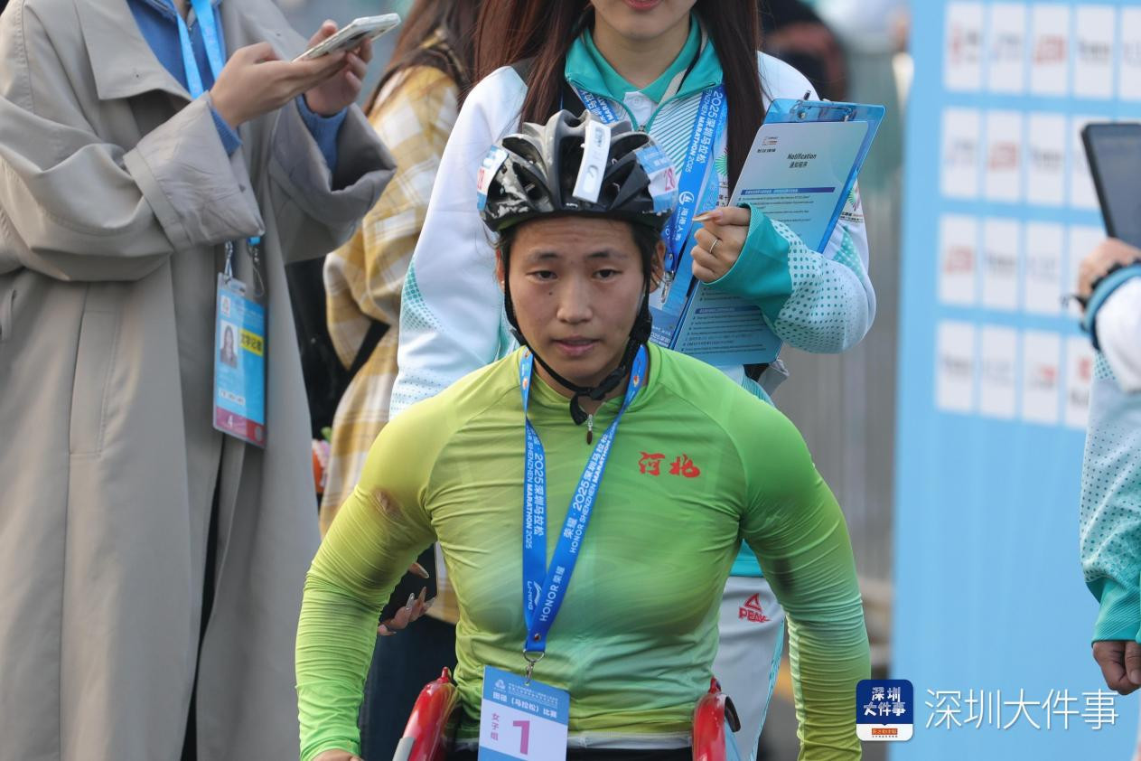 全程马拉松女子组T54级别的比赛上演了集体冲刺的精彩对决,广东选手陈晓纯以2秒的微弱劣势收获一枚银牌。