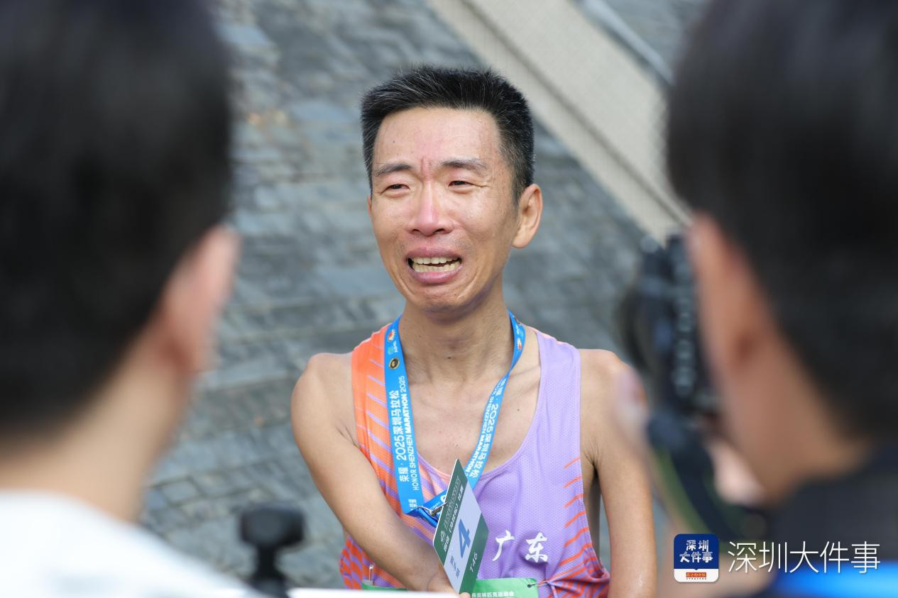 孙亮亮在赛后采访中喜极而泣,并展示“第四名冲线”的序号牌。