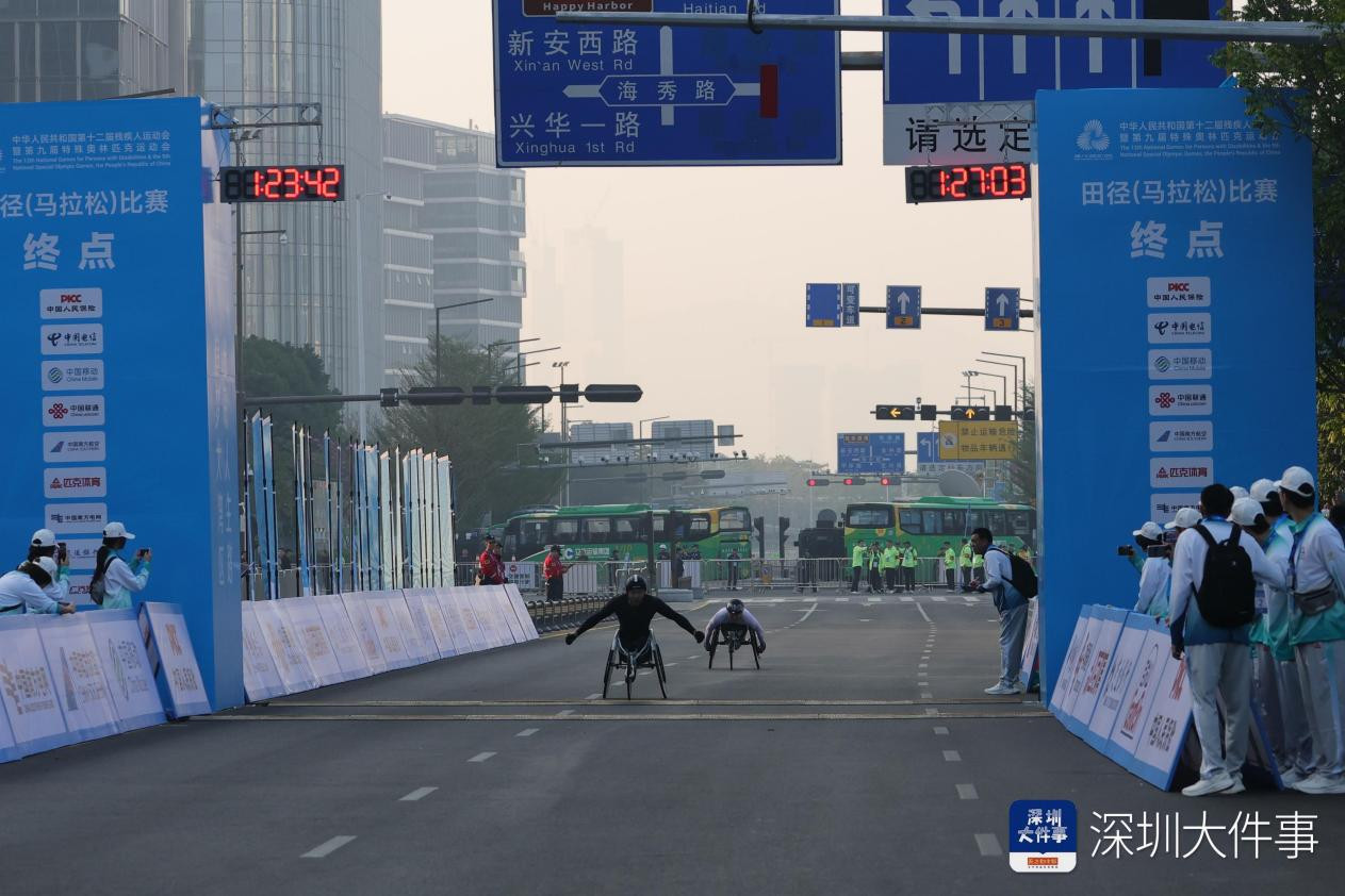 在率先发枪的全程马拉松T54级(竞速轮椅)比赛中,男子组决赛冲线阶段上演了惊心动魄的对决。来自辽宁的选手金华以1小时27分04秒的成绩率先冲过位于宝安区海滨广场的终点线,勇夺金牌。上海选手罗兴传以1小时27分05秒的成绩紧随其后,两人成绩仅差1秒,展现了顶尖选手间极致的速度与技巧。另一名上海选手代云强以1小时30分02秒获得季军。