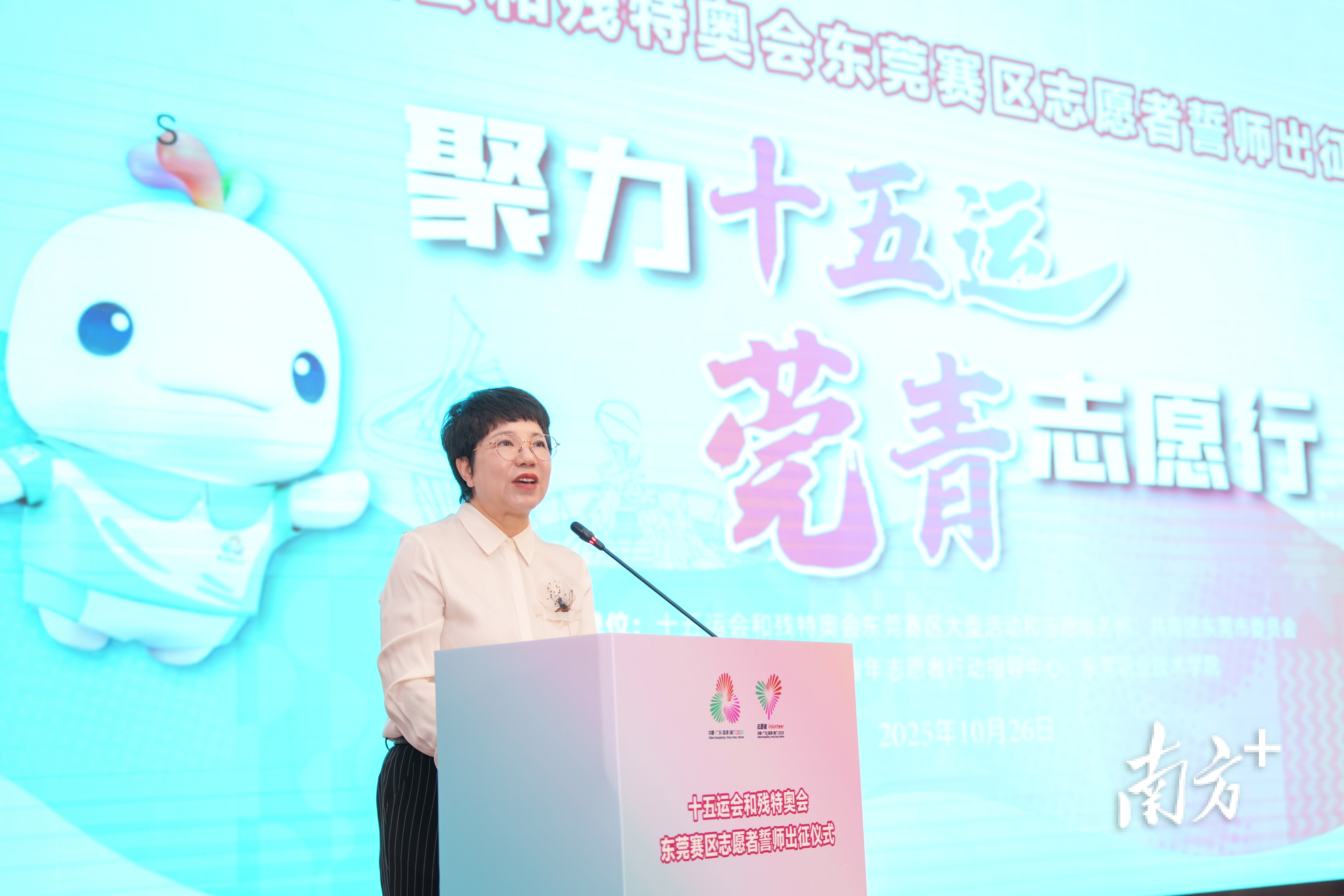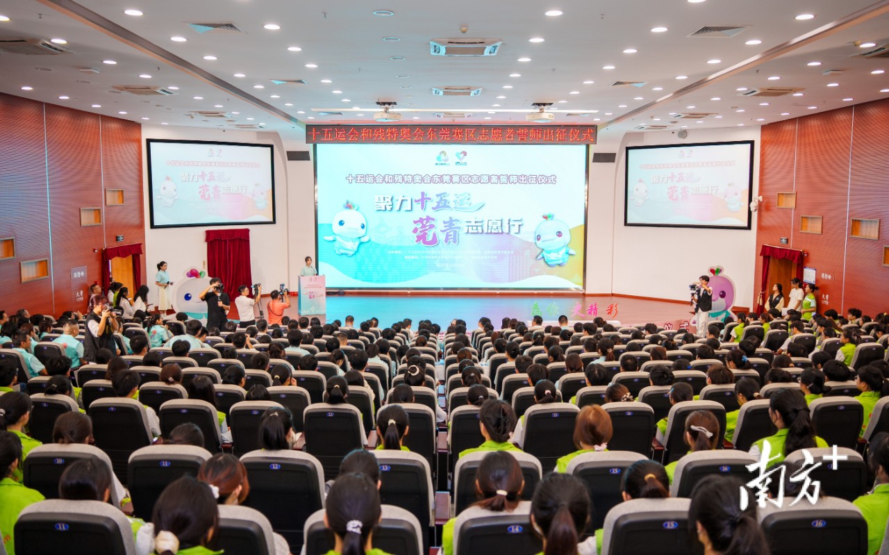 10月26日,十五运会和残特奥会东莞赛区志愿者誓师出征仪式在东莞职业技术学院举行。活动现场,志愿者代表集体誓师,将以最饱满的热情和最专业的服务,投身于篮球、举重赛事的志愿服务保障。仪式开始,十五运会歌与志愿者主题曲及MV奏响,激昂旋律点燃全场。东莞市执委会有关领导、市委社会工作部、团市委,6所任务高校,7个城市志愿服务重点镇街的领导、同志,以及350名志愿者代表共同见证这一重要时刻。