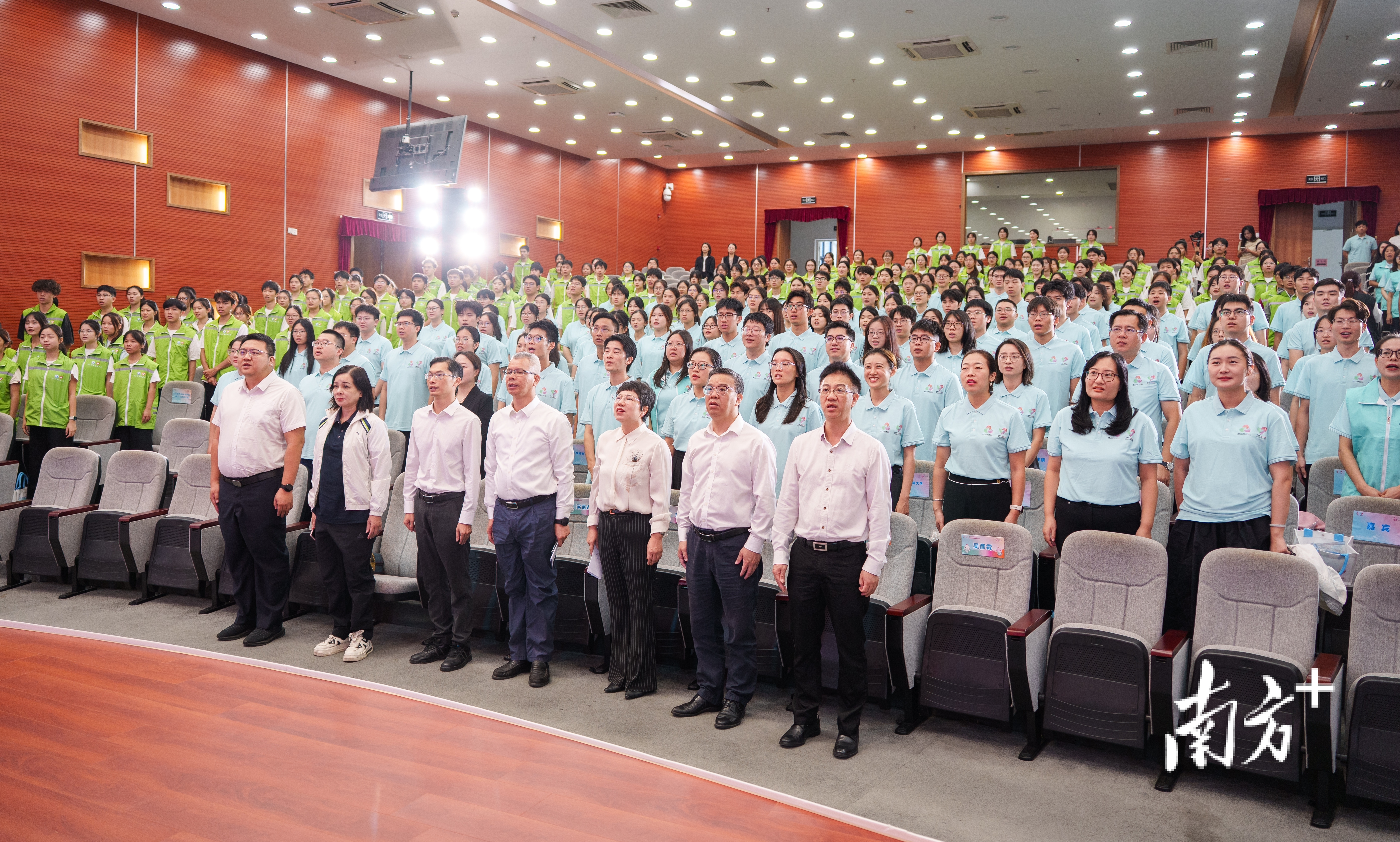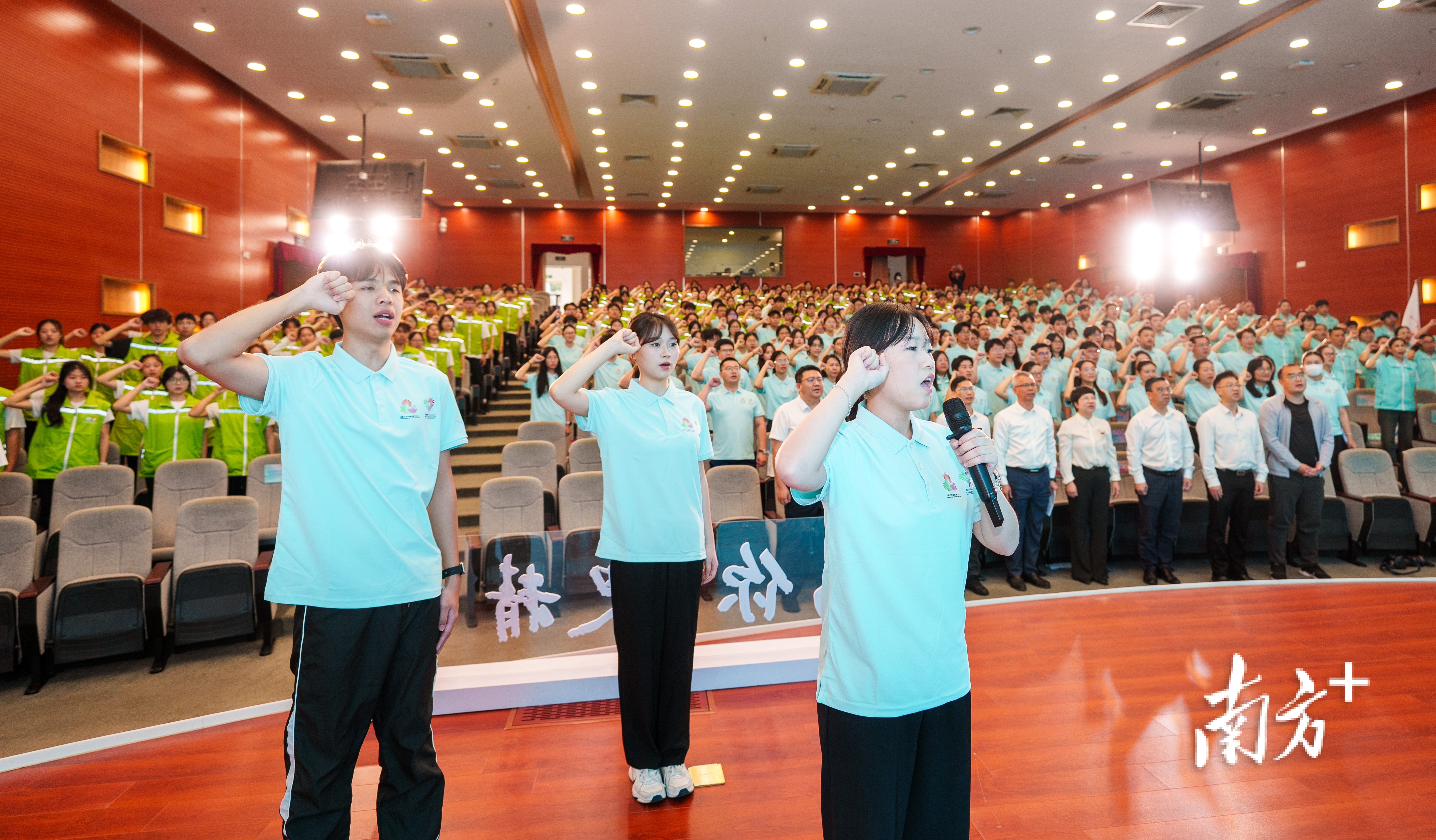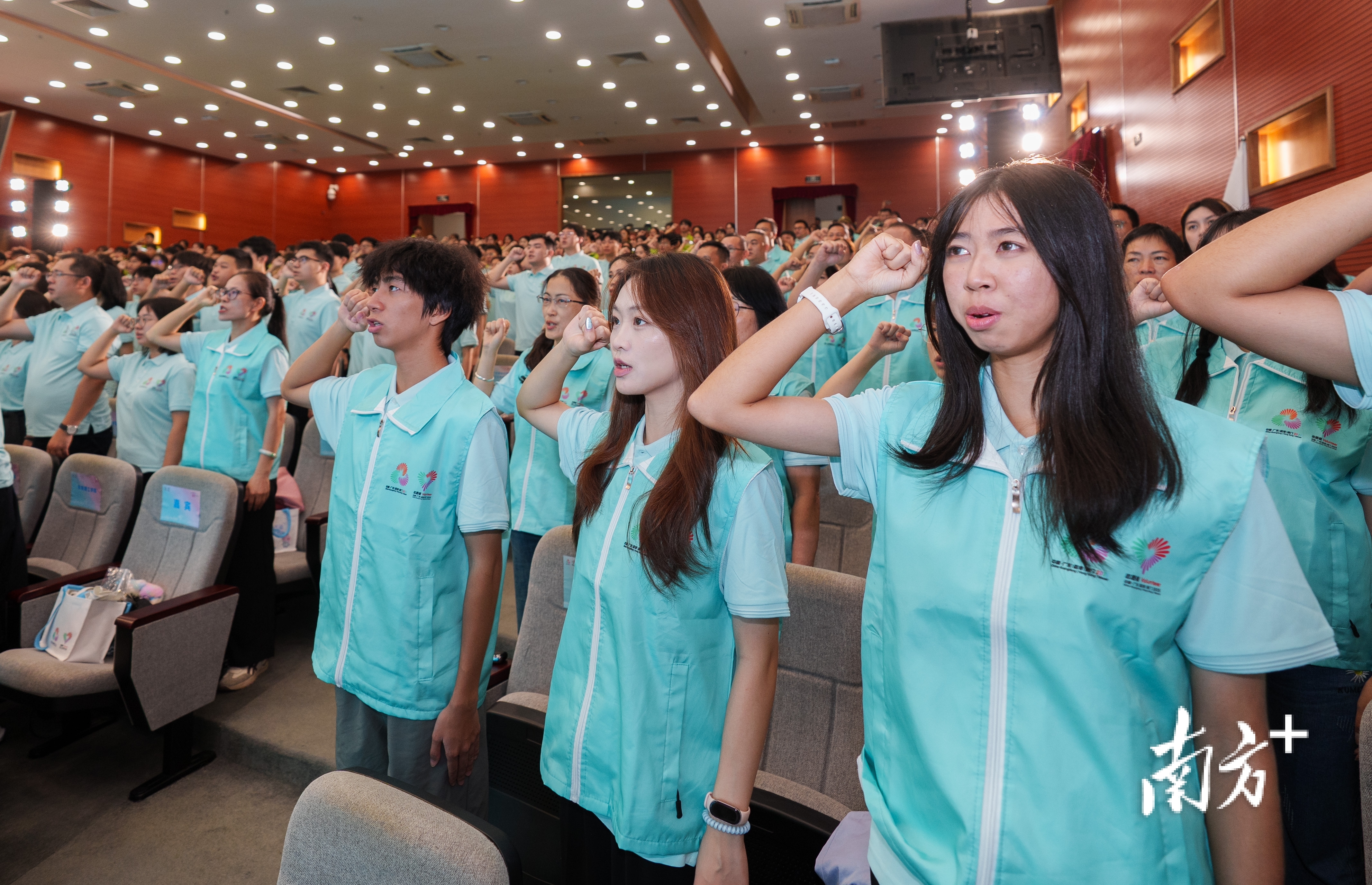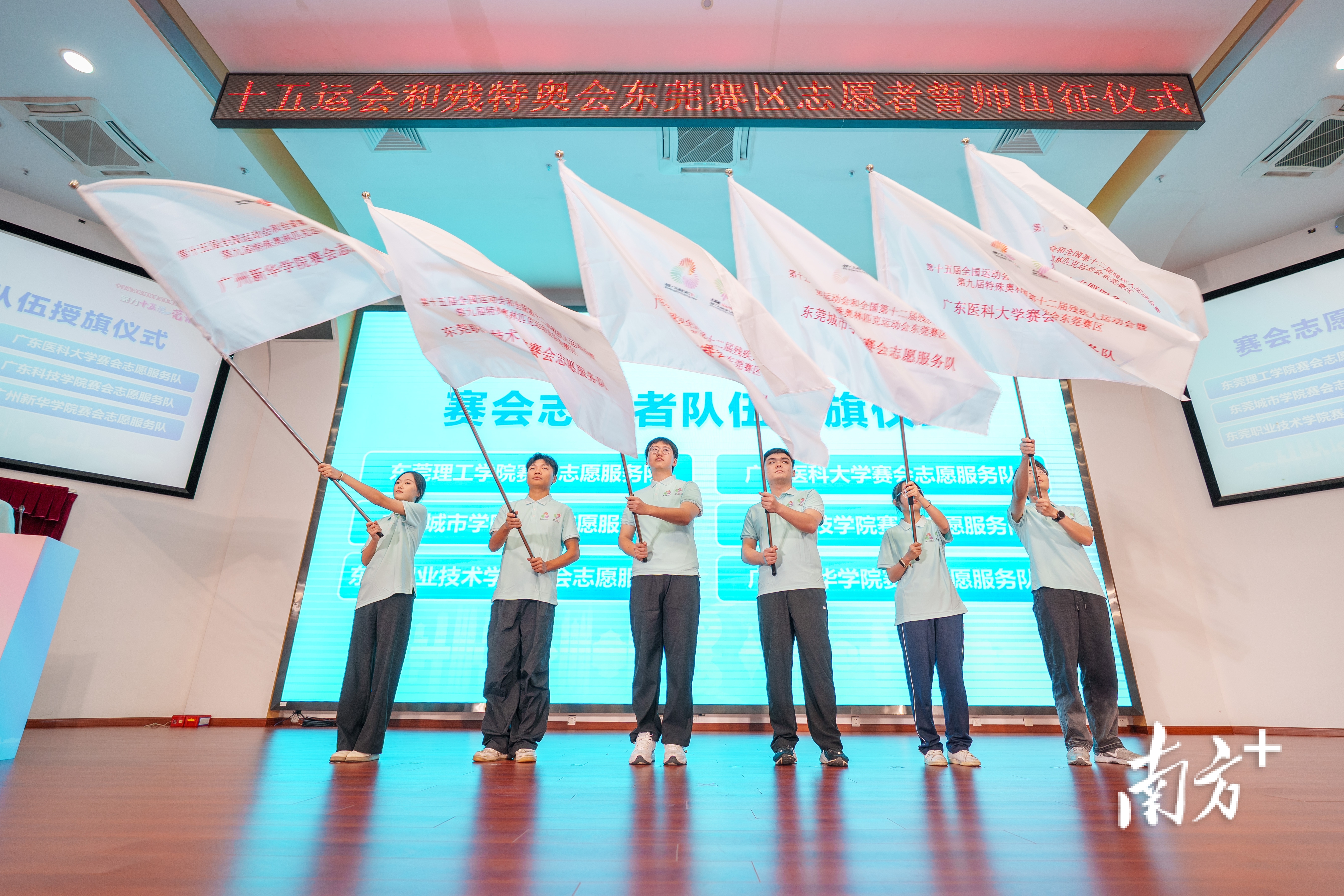 会上,十五运会和残特奥会东莞赛区赛会志愿服务队、城市志愿服务队获授旗。350名志愿者代表庄严宣誓:“我志愿服务十五运会和残特奥会,听从指挥、团结协作,微笑服务、不辱使命,践行志愿精神,弘扬先进文化,为湾区添彩,为祖国争光!为你,更精彩!”