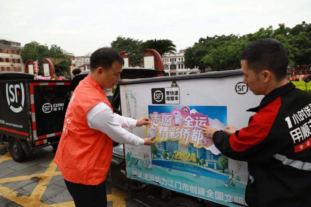 为了进一步加大十五运会和残特奥会的宣传力度,现场来自滴滴司机、顺丰速运、骑行之家、淘宝闪购、美团外卖等新业态群体代表,把印有“志愿全运 精彩侨都”的车贴,张贴在现场每一辆网约车与网络配送车上,使车辆成为承载着侨都热情、移动在城市脉搏上的“志愿名片”,把赛会的讯息和志愿服务的温度带到城市的每一个角落,实现最广泛、最深入的赛会宣传。